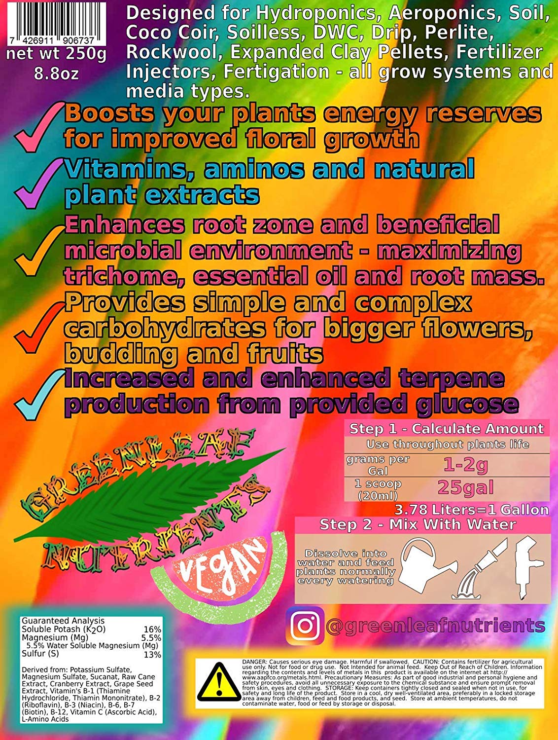 - Contains several different types of carbo sources, 20 amino acids, 70+ vitamins and minerals, isoflavonoids, anthocyanins, polyphenols, tannins and isoterpenes for superior aroma, potency and heavy yields.